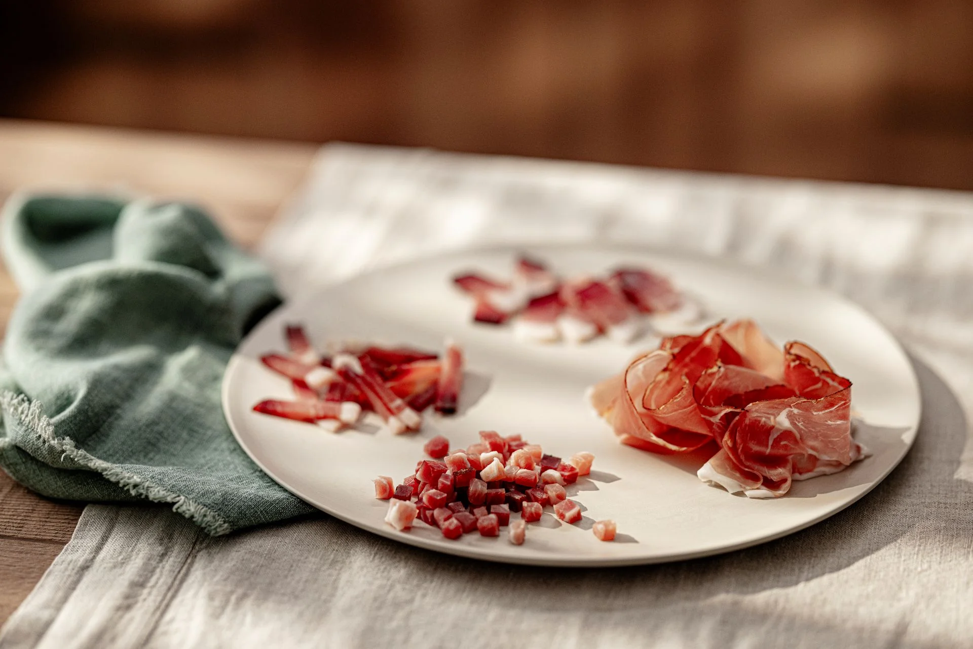 Seit 1996 ist diese Bezeichnung ausschließlich Speck vorbehalten, der aus dem Schlegel stammt und nach traditionellem Verfahren in Südtirol hergestellt wird. Das Grundrezept ist dabei seit jeher unverändert: wenig Salz, wenig Rauch, viel frische Bergluft – und noch mehr Zeit zum Reifen. Jeder Produktionsschritt orientiert sich an diesen grundlegenden Prinzipien.