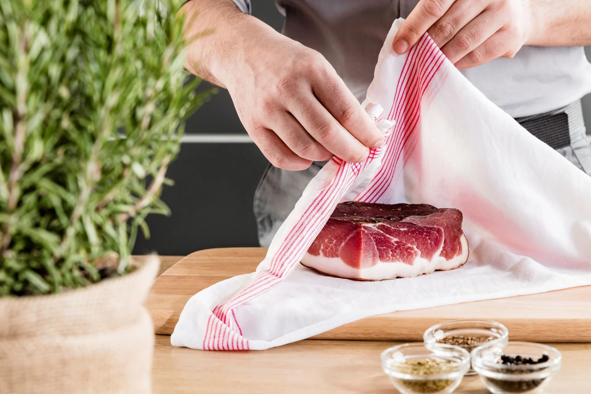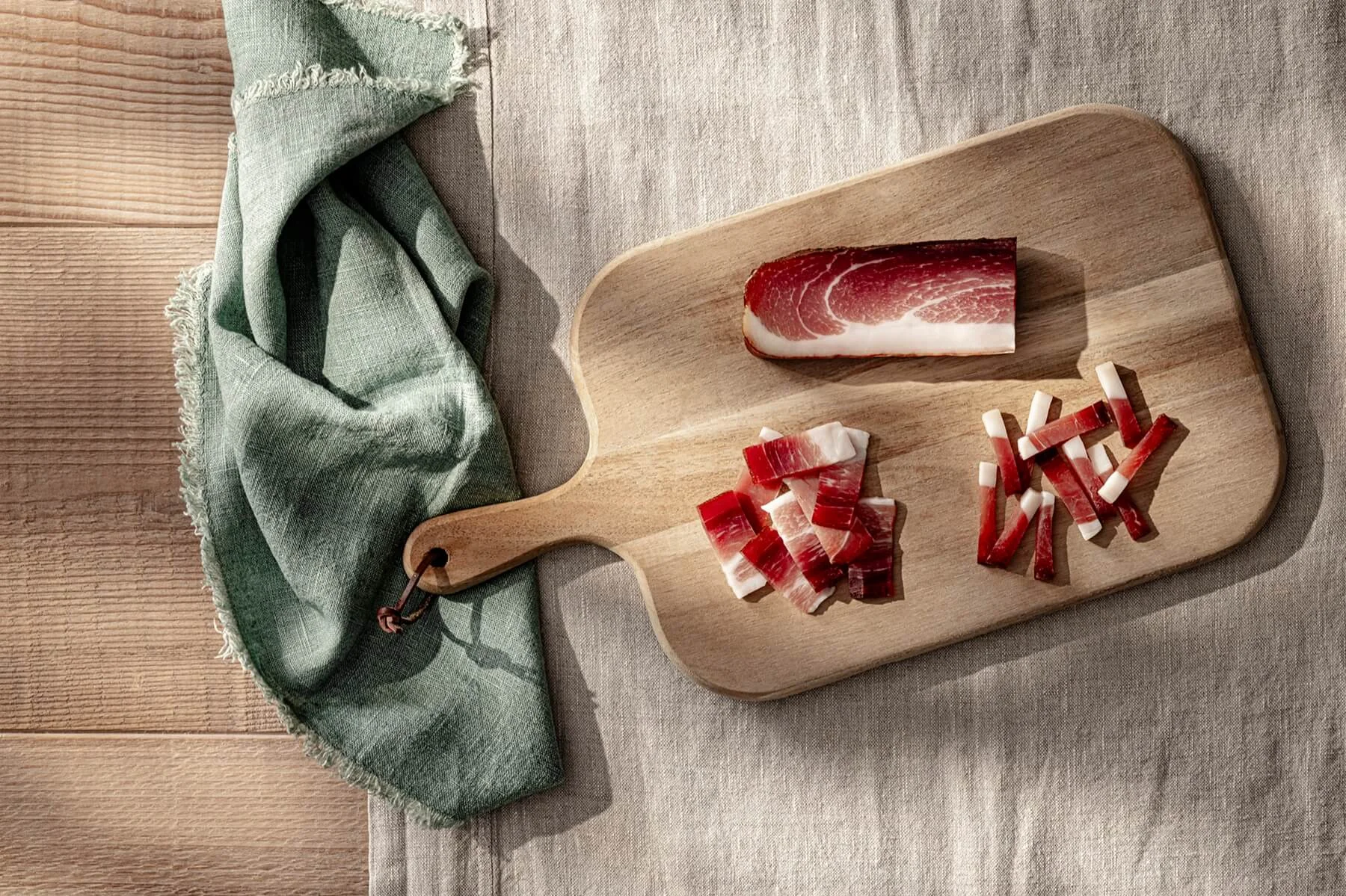 Erfahre, wie Südtiroler Speck g.g.A. richtig geschnitten und aufbewahrt wird, damit Aroma, Konsistenz und Qualität optimal erhalten bleiben.